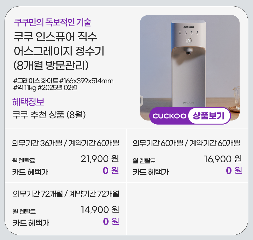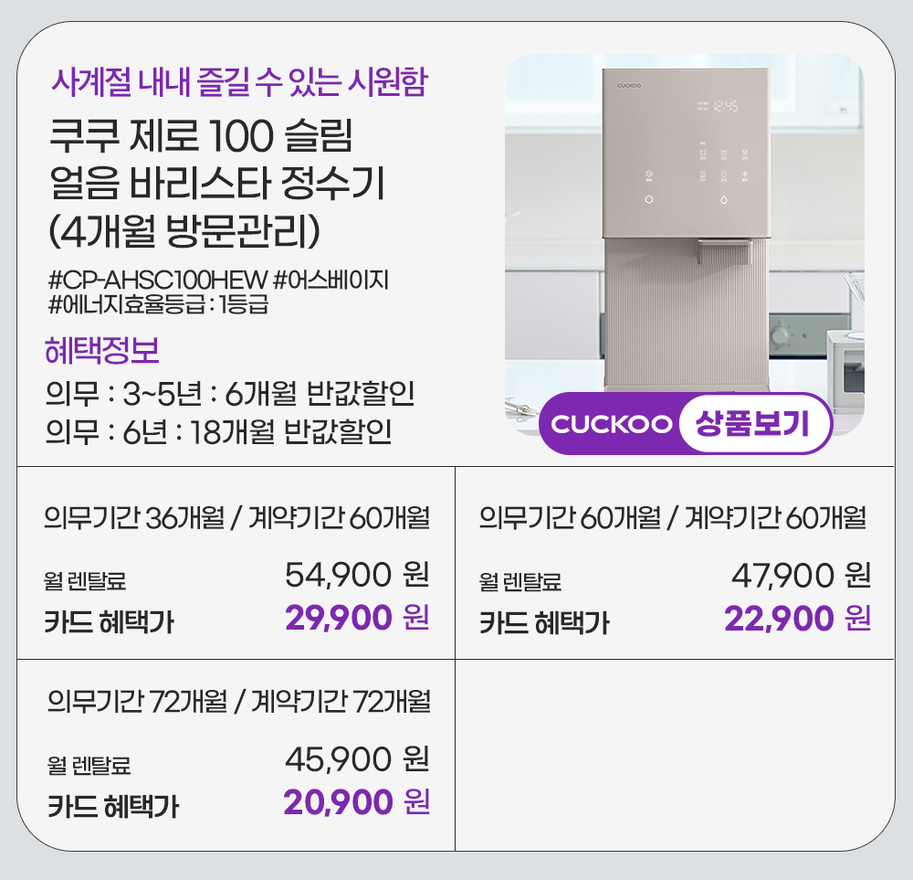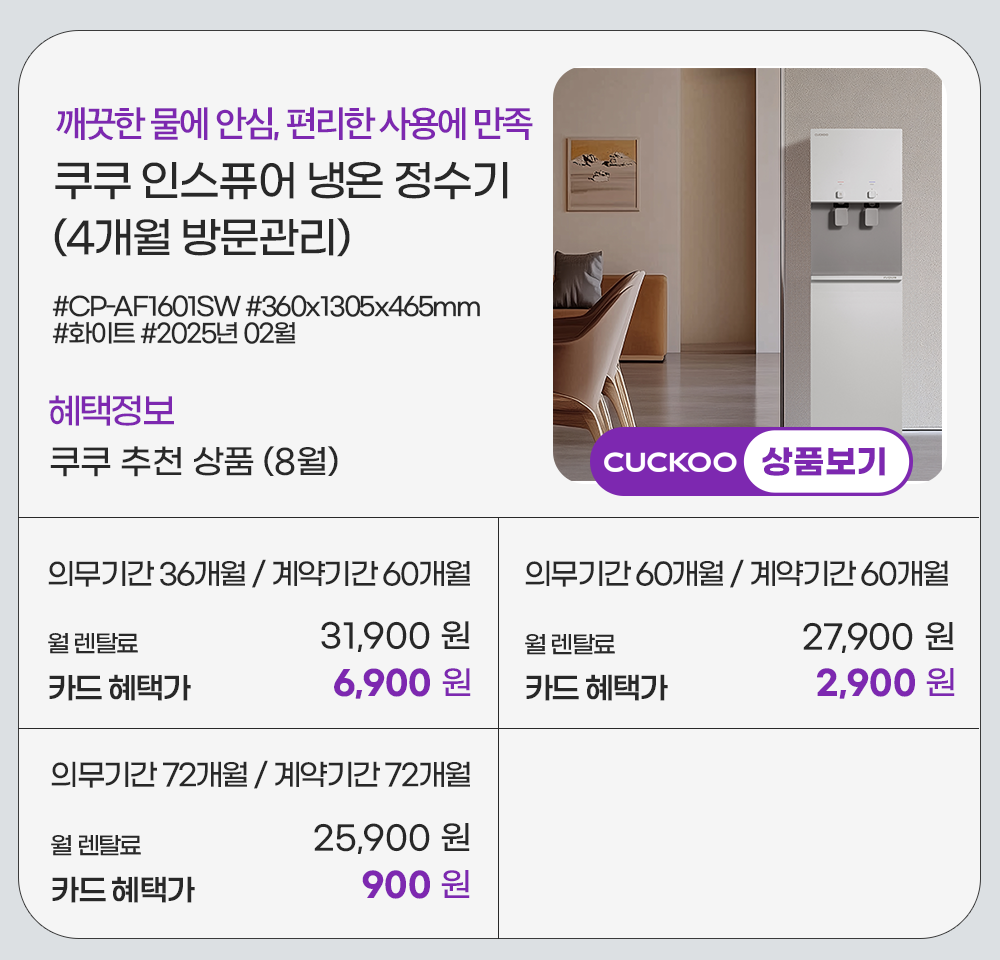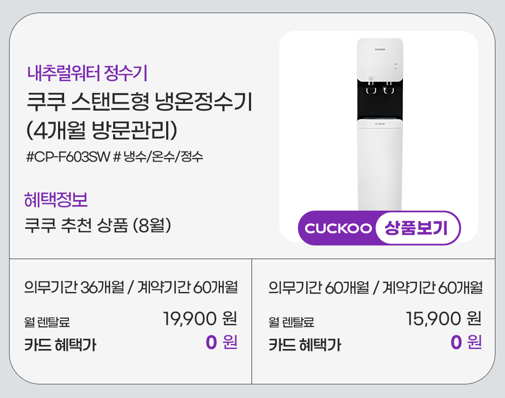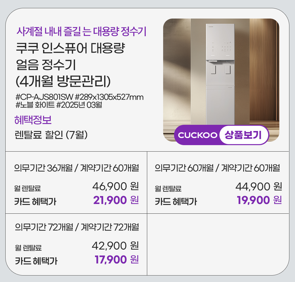 홈페이지 상담 및 렌탈 구매 필수 이름, 휴대폰번호, 주소 (우편번호, 상세주소) 렌탈 신청에 따른 고객 상담 및 렌탈구매 3개월